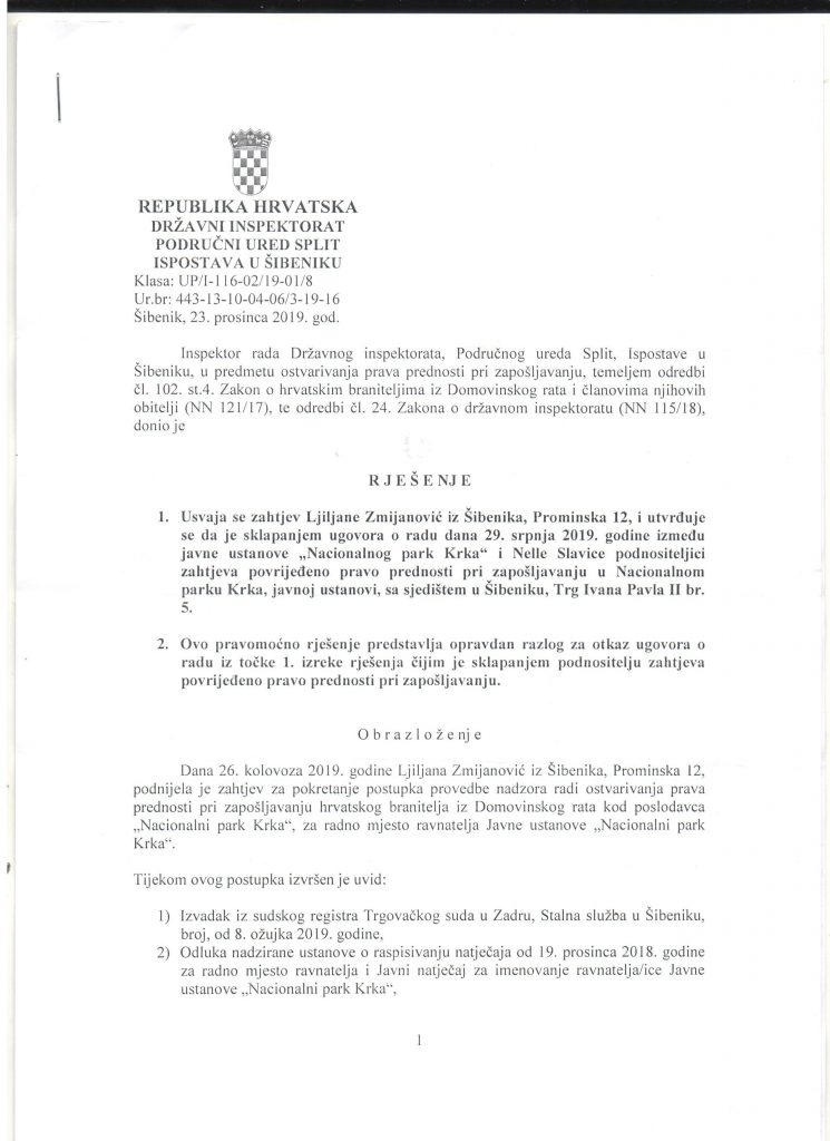 Državni inspektorat donio je Rješenje kojim je usvojen zahtjev dr.sc. Ljiljane Zmijanović povodom prijave inspektoratu za povredu prava koja proizlaze iz Zakona o hrvatskim braniteljima u smislu prednosti pri zapošljavanju.