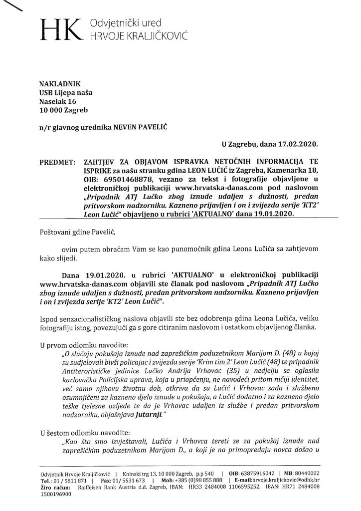 Hrvatska danas > Najnovije > Aktualno > Demantij teksta Pripadnik ATJ Lučko zbog iznude udaljen s dužnosti, predan pritvorskom nadzorniku. Kazneno prijavljen i on i zvijezda serije ‘KT2’ Leon Lučić