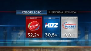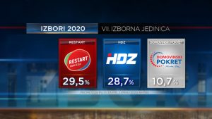 I posljednja, VII. izborna jedinica; napeto kao i prije četiri godine; Restart koalicija prvi je izbor za 29,5 posto birača. Nešto manje ima HDZ (28,7%), slijede Domovinski pokret (10,7%) i Možemo! (6,6%).