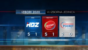U VI. izbornoj jedinici ponovno tijesna borba s istim pobjednikom kao na prošlim izborima 2016. HDZ i Restart su na oko 30 posto. Slijede Domovinski pokret (12,7%) i Most (4,9%).