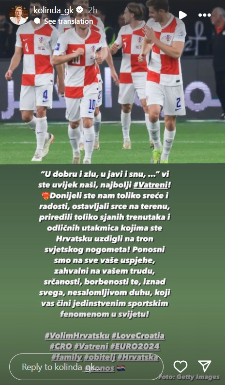 Naša bivša predsjednica Kolinda Grabar Kitarović oglasila se u svojoj Instagram priči nakon jučerašnje utakmice Hrvatske protiv Italije na Europskom nogometnom prvenstvu u Njemačkoj. Grabar Kitarović je inače poznata po tome da voli gledati utakmice i podržavati Vatrene.