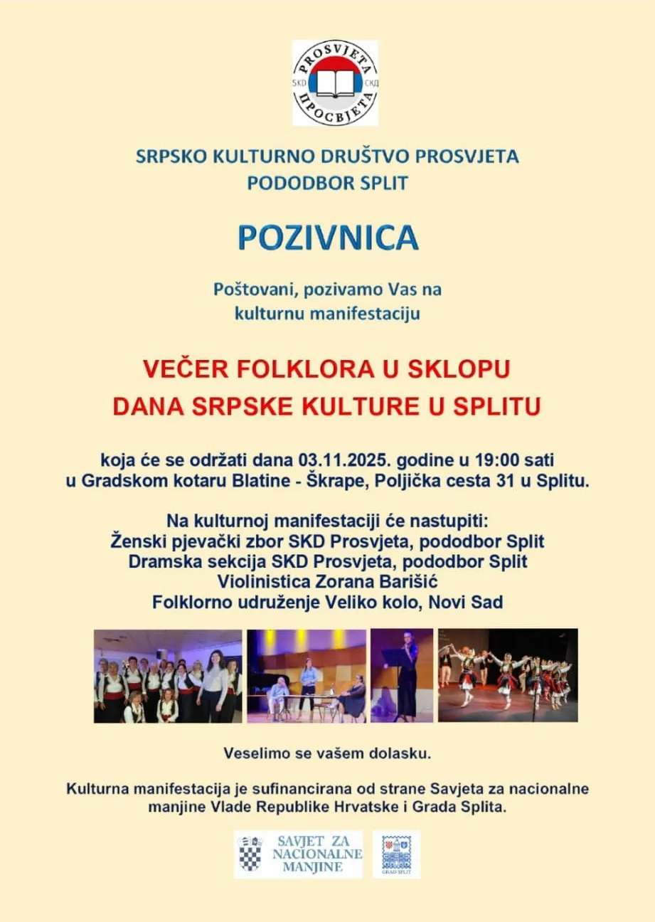 Nikola Vukobratović na fb-u je objavio kako je grupa ljudi istjerala iz dvorane folkloraše koji su trebali nastupiti u prostorima splitskog Gradskog kotara Blatine Škrape s početkom u 19 sati u sklopu Dana srpske kulture.