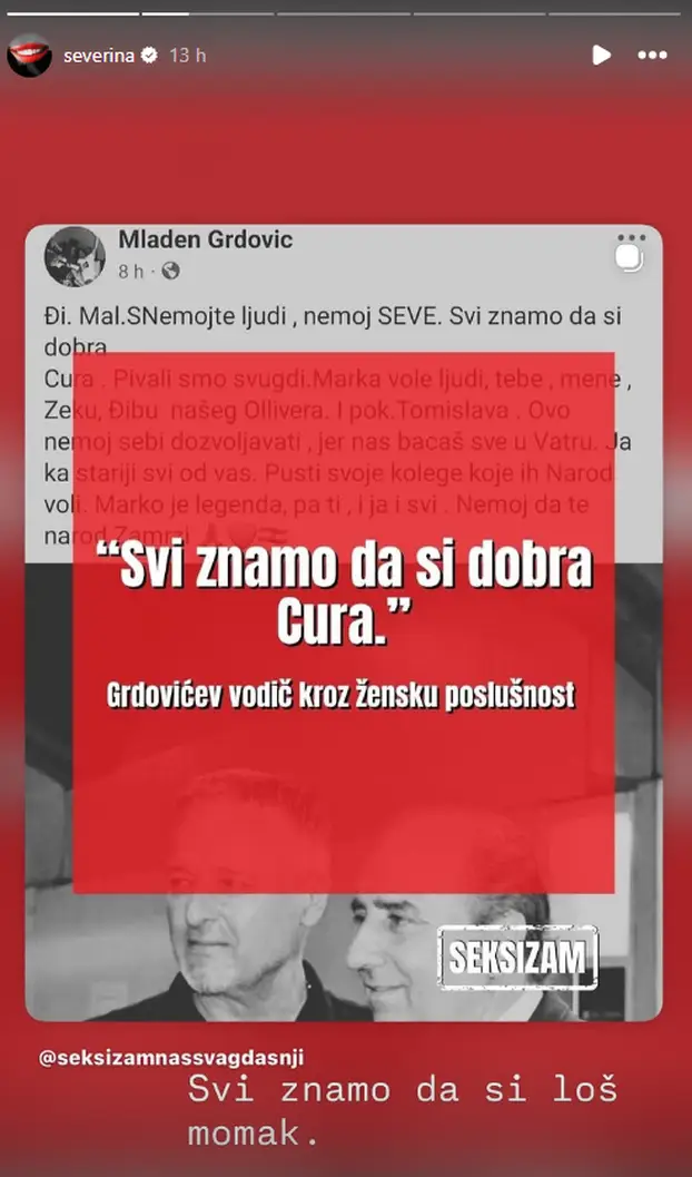 Severina mu je odgovorila mu je odgovorila na Instagram Storyju, podijelivši drugu objavu u kojoj piše: Svi znamo da si loš momak.